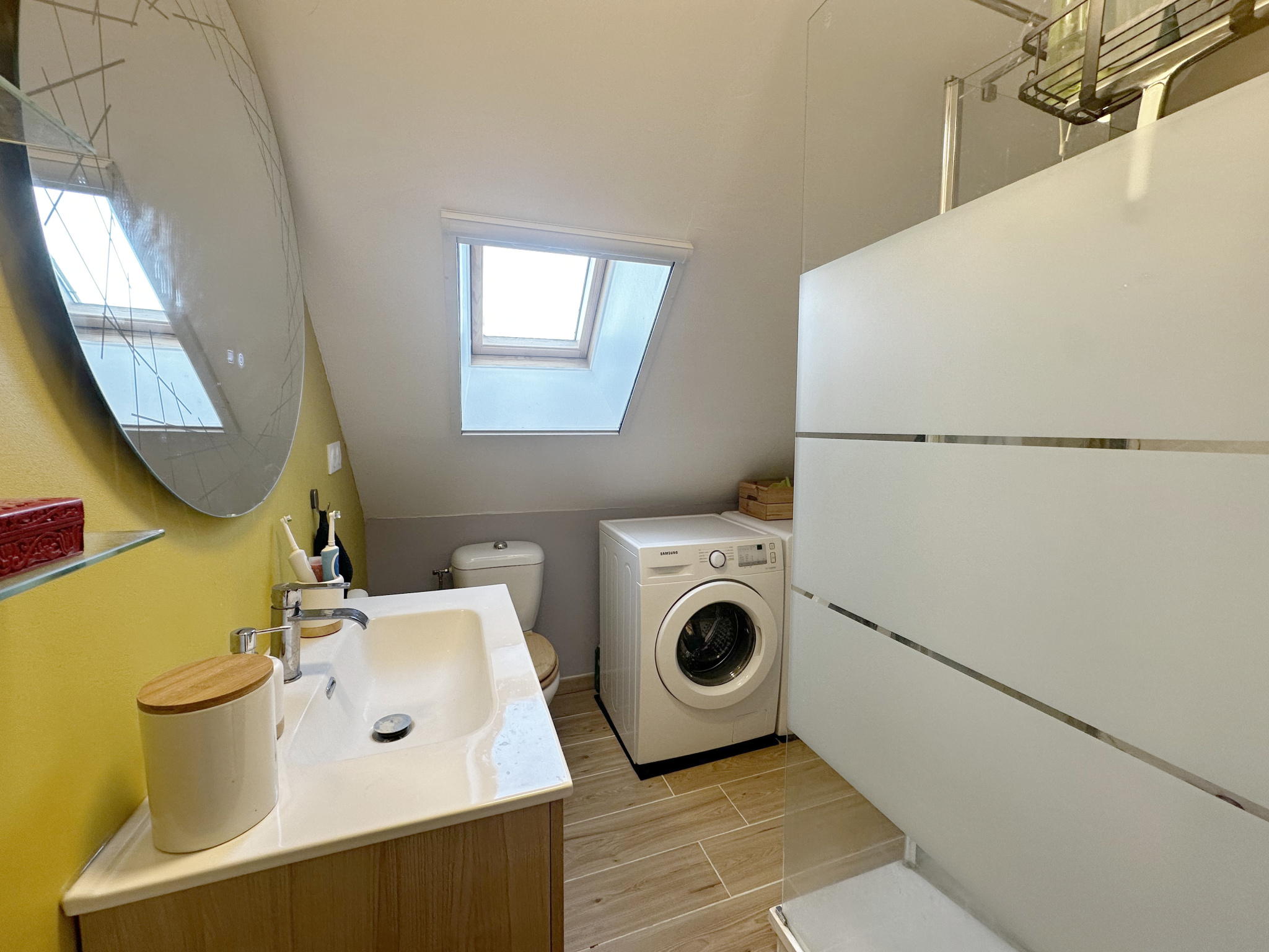 A l'étage, elle se compose d'une pièce palière desservant 2 chambres et une salle d'eau avec wc et coin buanderie.